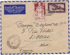 Very rare mixed franking of the 15C (blue) and 50C stamps paying an overall postage of 65C on a registered international letter (40 grams) sent from Saigon to Japan. This was during the Japanese Occupation of Indochina. The bank was privileged as it was exempt from the standard mail censure even during that time as indicated by the red hand stamp “Sce de la Banque Privilege del Indochine”.