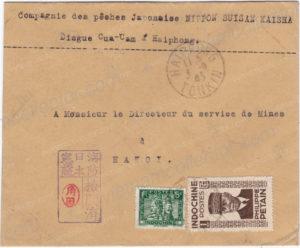 The Japanese, focused on defeating the Chinese, were initially not interested, to saddle themselves with additional responsibilities consuming money and man power that a full occupation would have demanded. They instead showed a relatively light touch that also left the existing French postal system pretty much alone. Very few Japanese censor marks appear at the time and it was mostly official and company mail that was occasionally censored. The very rare letter below, which is ex Desrousseaux, shows a letter from a Japanese Fishing Company in Haiphong to the Director of Mining Services in Hanoi (a post occupied by J. Desrousseaux). The violet Japanese censor stamp along with the red seal of the censoring officer is prominently displayed on front. Japanese Military Mail was, of course, not transmitted using the French postal system but the Japanese Military Mail system.