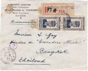 So, of course, with that kind of challenge the authors philatelic “hunting instincts” were on to systematically scan his collection and cover offerings just for such material. The result was a few covers that seemed to fit the bill of additional markings and foreign mail. Below is a cover front featuring a pair of 40 cent blue-green Petain stamps from a registered letter mailed on February 19, 1943 from Saigon to Thailand. Please note the French circular censorship mark at the bottom left, that the Japanese continued to use. According to Desrousseaux the Japanese often unglued the envelopes by steam and so did not always use the old French banderoles.[4]