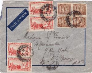 Single franking of the 10C value (blue) on an international printed matter mailing sent from Saigon Central to France in July of 1941. Since the letter was addressed to the part of the country that was affiliated with the German occupiers (Vichy) it was not censored by the Japanese that occupied Indochina at the time. However, the letter got intercepted in South Africa and was censored by South Africa that was aligned with the British Empire as indicated by the red censor banderole used to re-seal the letter.