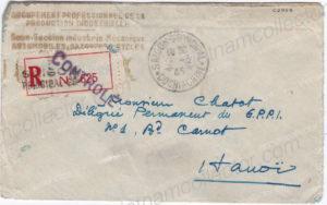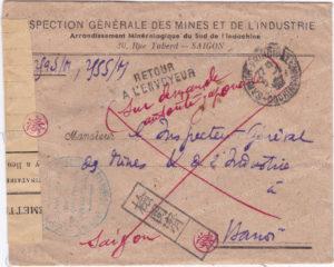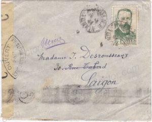 Below is a cover sent on March 14, 1943 from Saigon to Cannes. Since that was situated in a part of France controlled by the German aligned Vichy Government the cover was not censored (Germany was a Japanese ally). The next letter shows a domestic cover sent from Hanoi to Saigon to, what the editor presumes was Desrousseaux’s wife. The cancel is a bit smeared but the date looks like April 16, 1944. The 10C domestic tariff came in force on December 1st, 1943 and lasted until the end of December 1944. Again, the cover was censored by the Japanese using the old French military censor marks and in this case the banderole “Controle Postal Militaire”. Why this civilian cover was picked out to be censored is not known but it may have to do with the fact that J.Desrousseaux was employed as a high-level manager in the mining industry, and that the Japanese wanted to keep tabs on key industries and its personnel.