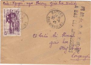 Already by June 1945 Vietnamese propaganda cachets supporting Vietnamese identity or proclaiming the independence of Vietnam started to pop up alongside the postal markings that were still in French. Here is a domestic letter correctly franked with a 15C Alexandre de Rhodes stamp that was sent on July 26th, 1945 from Tieu Can in Cochinchine to Phnom Penh in Cambodia. Apart from the city and State the address was written in Thai which apparently could not be read by postal workers. The address was hence crossed out with blue ink and a French cachet “Parti Sans Liaison d’Adresse” or Party without address was applied on front. Also a Vietnamese propaganda cachet stating “Vietnamese only write in Vietnamese” and French cachet stating “Return to Sender” was struck. The letter went onto an odyssey through Tra Vinh on July 26th, 1945, Saigon on December 5th, 1945 and finally Pnom Penh on December 14th, 1945 as indicated by the transfer cancels on the back.. A manuscript handwriting “Recipient without leaving address” was noted on the reverse. How the letter made it back to the sender is unknown.