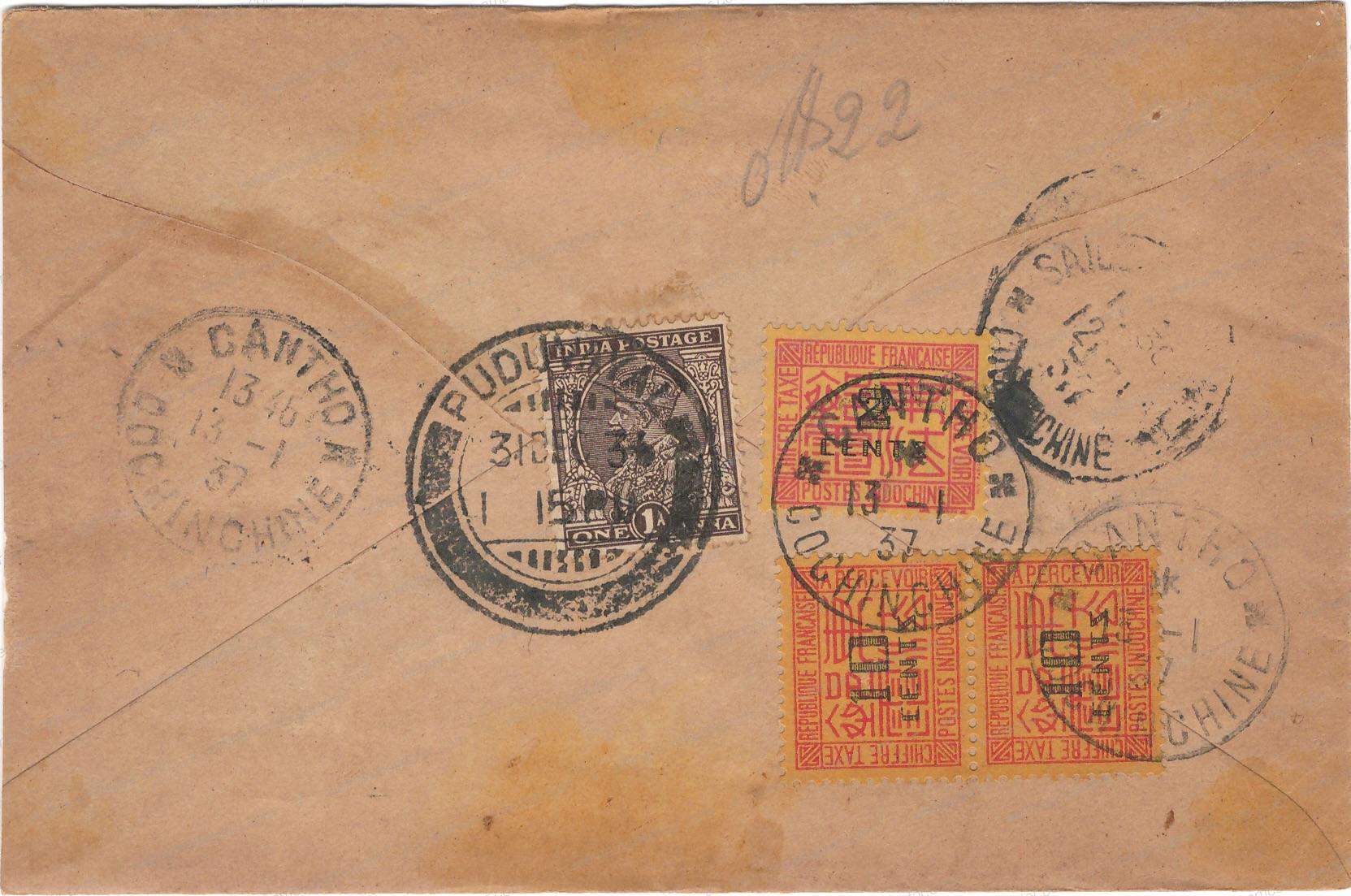Incoming international letter sent from India to Cantho in January of 1937. The letter was apparently under-paid with only 1 Anna and hence received a black “T” cachet in a circle. As a result 2C and 10C (2) postage due stamps were added to pay for the missing postage.